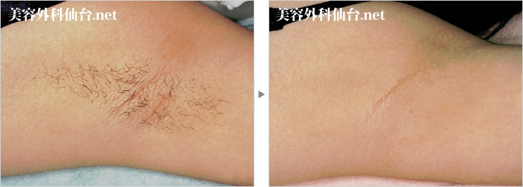症例経過:脇毛の処理が連日大変ということで、医療レーザー脱毛を希望された症例です。わき毛が太く濃いために、連日の処理によりカミソリ負けを起こしていました。医療レーザー脱毛を行うことで、少しずつ脇毛が細くなり、密度が疎らになりました。脇毛処理が不要になりました。